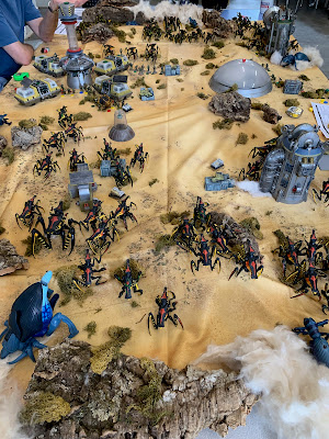 At the last club meeting we played a game of Starship Troopers using 25/28mm figures and lots and lots of Bugs!. The rules were a home-brew set that were easily picked up and allowed the game to move at a good pace. The terrain was a great example of recycling, kit bashing and scratch building with some time being taken to try to identify the origins of the various pieces!